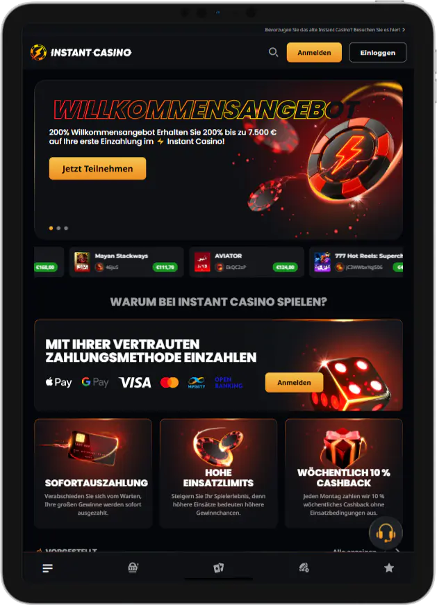 Nachdem Sie Casino Instant mobil starten, erwartet Sie eine strukturierte und moderne Oberfläche, die speziell für mobile Geräte entwickelt wurde. Die App startet direkt in die Spiele-Lobby, in der Sie zwischen Slots, Tischspielen, Live-Casino und Spielerboni wählen können. Kein Schnickschnack, sondern Fokus aufs Wesentliche, und das macht richtig Laune.