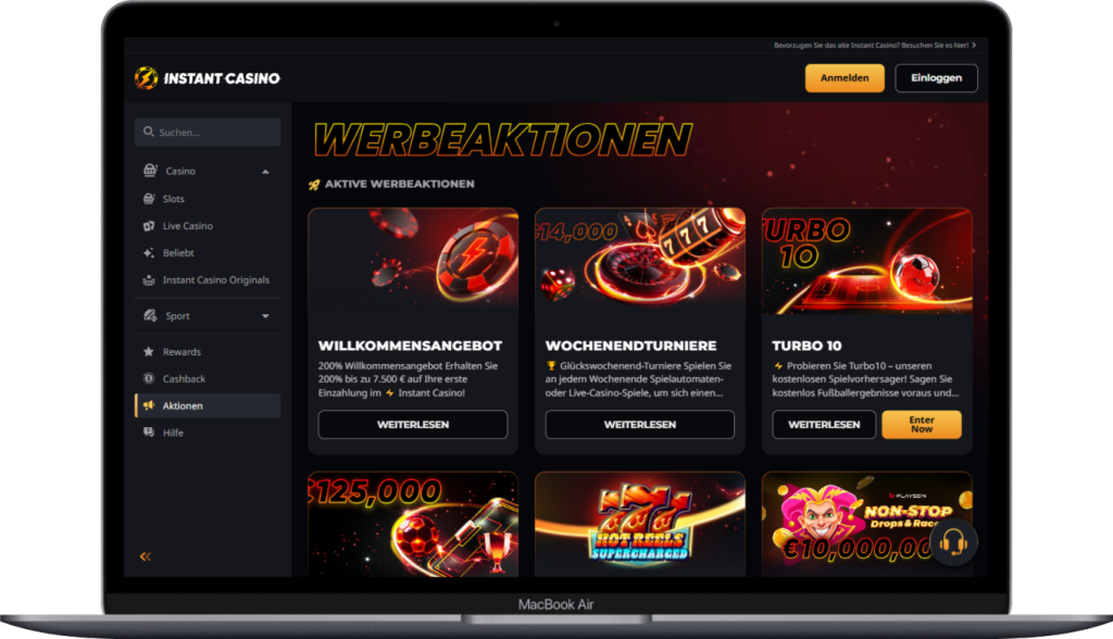 Bei Casino Instant erwarten Sie zahlreiche Bonusangebote, die nicht nur großzügig, sondern auch überraschend vielfältig sind. Von klassischen Willkommensaktionen bis hin zu einzigartigen Turnieren am Wochenende ist hier für alle Spieler etwas dabei. Wer neu ein Konto erstellt, bekommt sofort einen Schub durch den Willkommensbonus, ganz ohne einen Instant Casino Promo Code und auch Bestandskunden profitieren regelmäßig von kreativen Bonusaktionen und Loyalty-Programmen.